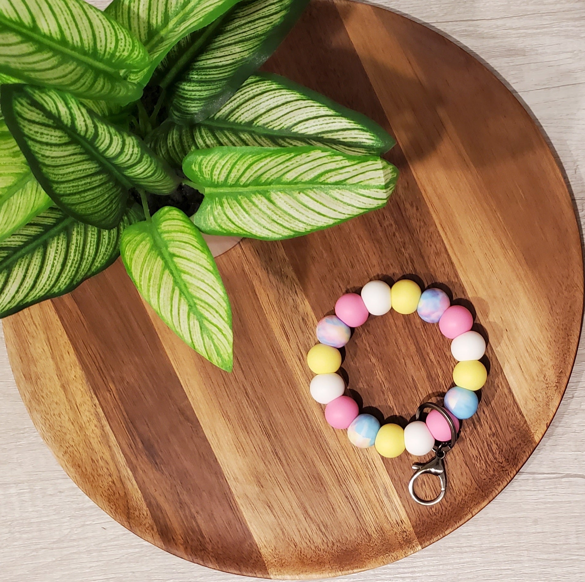 This wristlet features 19mm silicone beads assembled with a durable nylon cord, making it perfect for keeping track of keys, attaching to backpacks, or accessorizing purses.